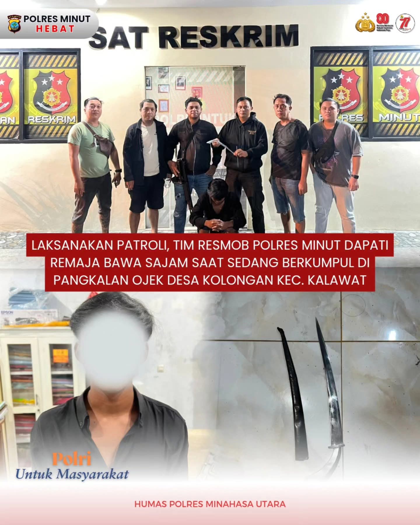 SulutKarya.com Minahasa Utara, 10 September 2025 — Satuan Reserse Kriminal (Satreskrim) Polres Minahasa Utara mengamankan seorang remaja yang kedapatan membawa senjata tajam (sajam) saat sedang berkumpul bersama sejumlah temannya di pangkalan ojek Desa Kolongan, Kecamatan Kalawat, pada Selasa malam (09/09).
