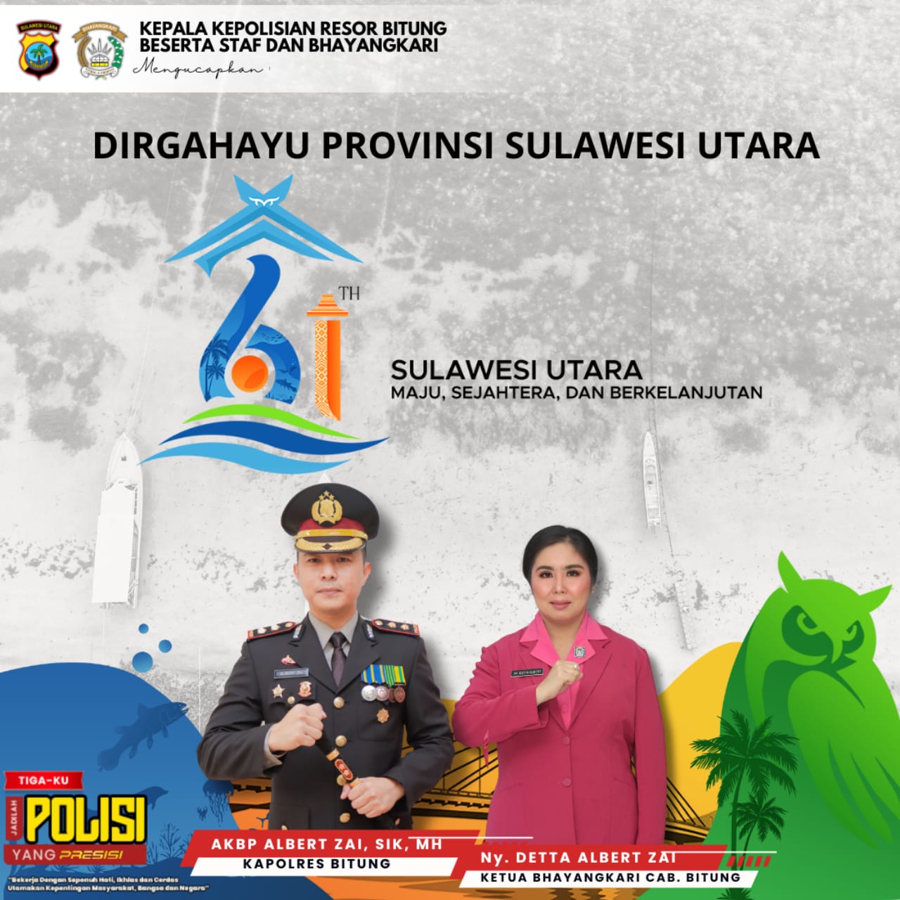 SulutKarya.com Bitung, 23 September 2025 –Humas Polres Bitung-Dalam suasana penuh syukur dan sukacita, Kapolres Bitung AKBP Albert Zai, S.I.K., M.H., bersama seluruh jajaran staf dan Bhayangkari turut mengucapkan Dirgahayu ke-61 Provinsi Sulawesi Utara. Sebuah momentum yang tidak hanya menjadi perayaan usia, tetapi juga menjadi waktu yang tepat untuk merenungkan kembali perjalanan panjang, pengorbanan, dan semangat juang yang telah membawa daerah ini menuju kemajuan yang membanggakan.