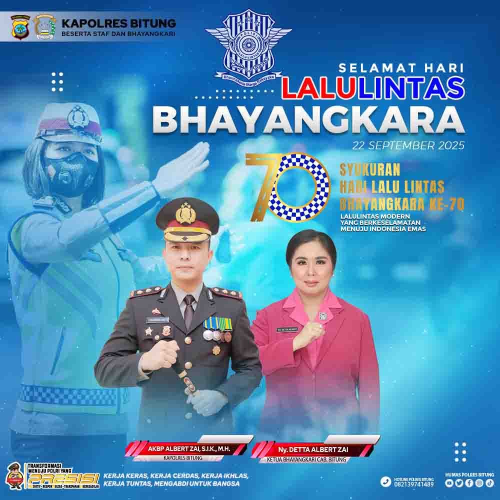 > “Saya, AKBP Albert Zai, S.I.K., M.H., Kapolres Bitung, mengucapkan Selamat Hari Lalu Lintas Bhayangkara ke-70 kepada seluruh personel Satuan Lalu Lintas Polri, khususnya jajaran Satlantas Polres Bitung. Terima kasih atas pengabdian, loyalitas, dan kerja keras dalam menciptakan lalu lintas yang aman dan tertib. Semoga ke depan kita semakin profesional, humanis, dan dicintai masyarakat,” ujar Kapolres.